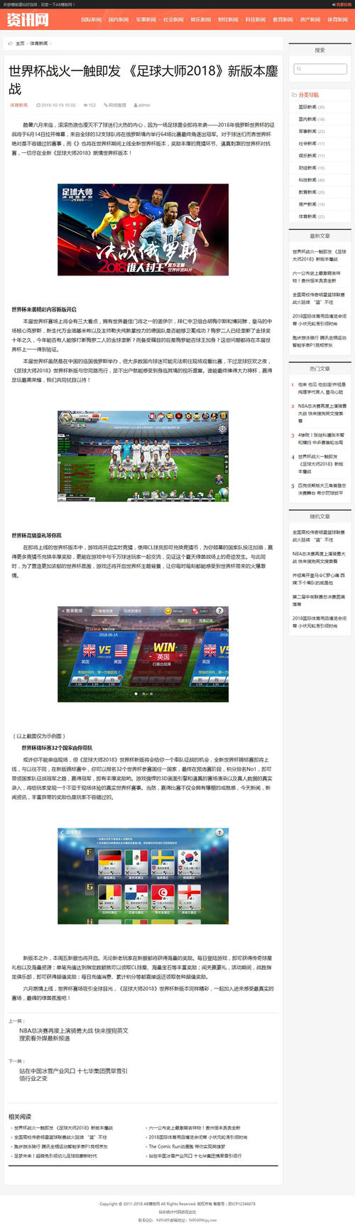 足球资讯网站源码可应用于世界杯新闻资讯、足球、体育赛事、美女图片等图片、文字、视频、音频类型的网站建设,搜索引擎排名效果好,承载数据量大,承载访问量大,安全性高,功能和模板可通过插件形式扩展。