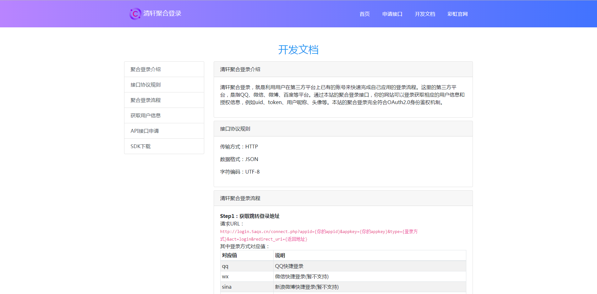 为彩虹聚合登录系统二开,后台采用光年layuiadmin改版,非常漂亮 本系统增加了前台界面、开发文档、SDK文件后台增加站点配置可随意修改前台内容 聚合登录中转API是一个可以实现中转QQ、微信、支付宝、微博、百度等平台的快捷登录接口。 有多应用管理...