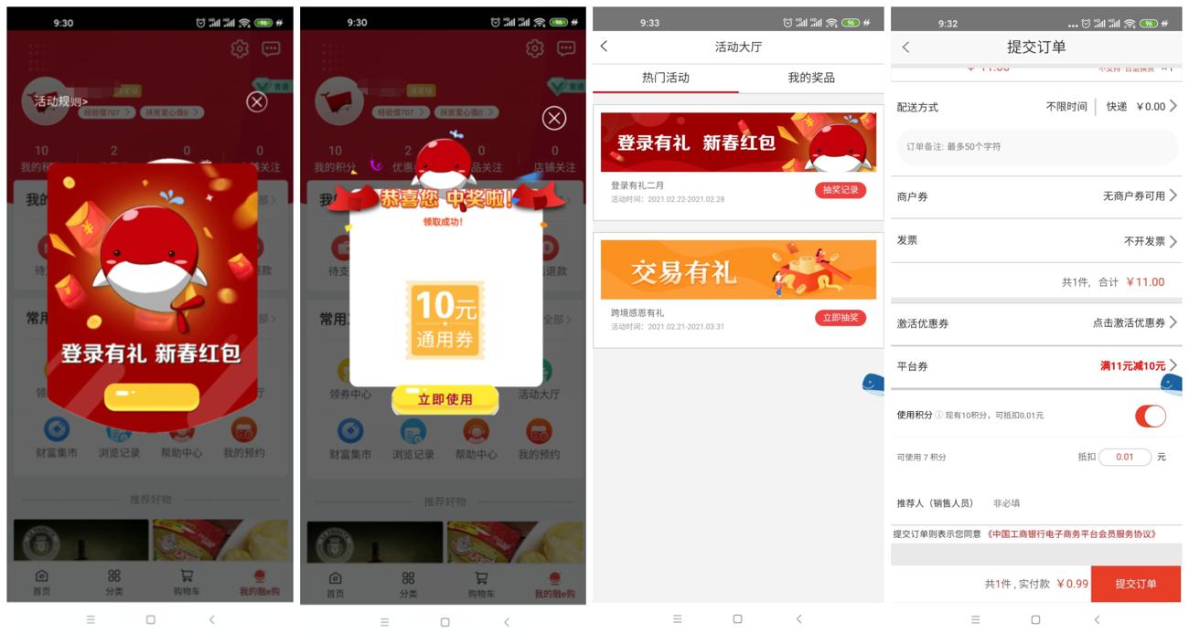 1、下载打开融e购APP->登录后就有弹窗->抽中通用券才有用->抽中后点使用