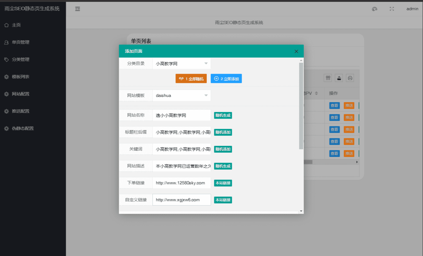 一款随机静态页面生成系统,一秒钟可生成上千条单页面,批量生成单页用来做SEO是非常不错的源码。雨尘SEO静态页面生成系统源码v1.3版本,支持文章采集,功能,多模板选择批量生成单页,本次更新增了百度自动推送和网站地图sitemap功能。