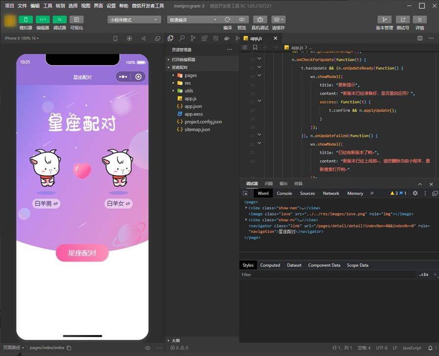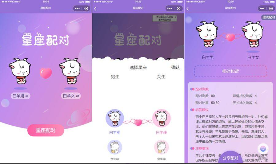 恋爱星座男女配对微信小程序源码、星座运势微信小程序源码,简单测试了一下,这款小程序还不错,无需服务器无需域名上传发布即可使用。