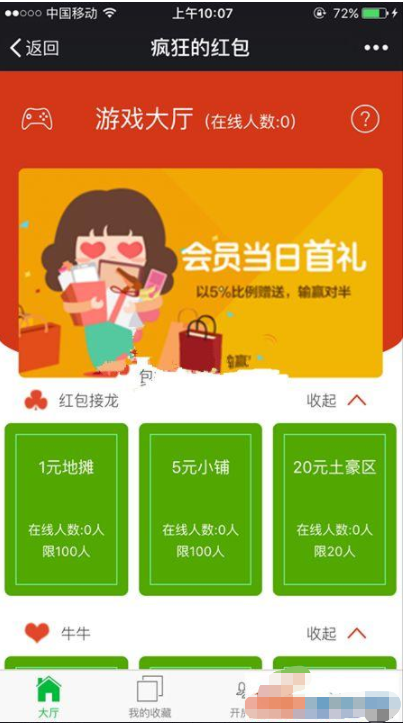 牛牛有戏有多个版本,版本1:**自己可以参与抢包,自己的抢的包作为与闲家比较的点数,当过期时间到,**未抢包,系统会为**自动抢一个包最为**点数。版本2:**自己不能抢包,最后一个人抢的包最为**点数,而这个人抢到的数字是福利,不参与输赢比较。**用他的点数与其他玩家比较,游戏不设过期时间。一直等到包抢完。