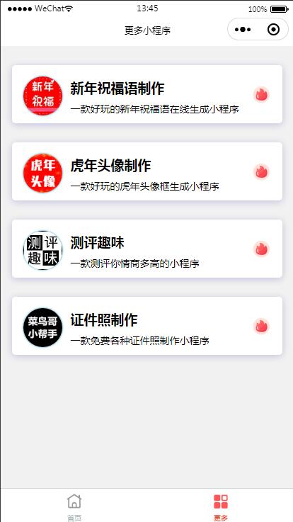 虎年即将到来祝大家虎虎生威! 新年可以搞一波,流量主小程序! 有趣味评论 有证件制作! 工具还是比较全的!