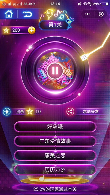 2,程序自带5417条猜歌数据,10000多段歌曲(包括猜歌前奏及答对后高潮的音乐),所有MP3资源加在一起有2G多,当然歌曲都已经存放在阿里云可直接使用,你可以上传到自己的服务器调用。
