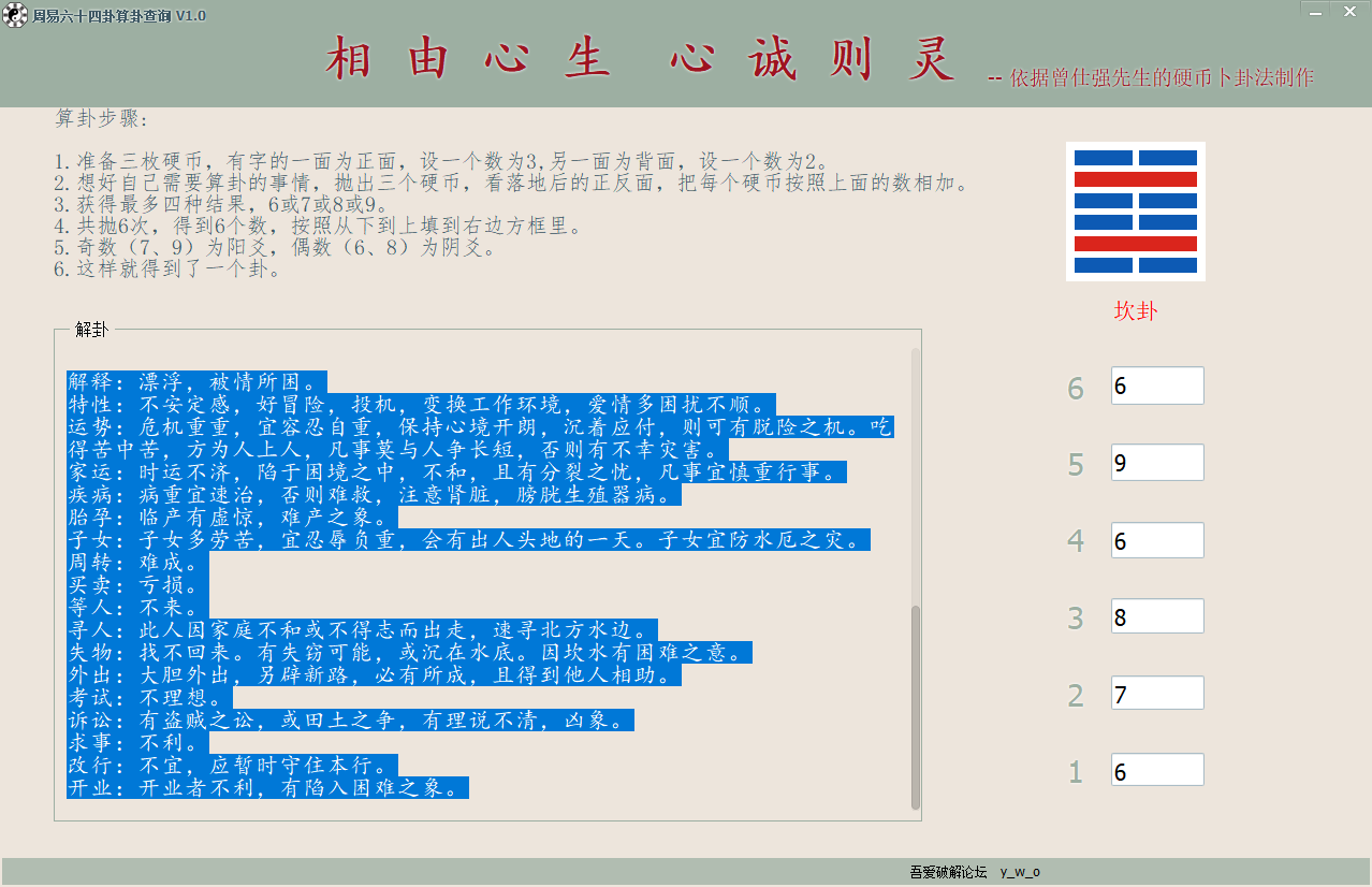 家运:诸事宜心平气和处理,守其井水,供来往人用,为守旧之义。诸事宜防有变。
