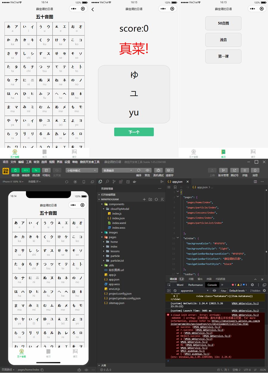首页包含了日语中的50音图,让用户可以在小程序中看到日语词和跟读发音,学习完50音图以后还可以进行练习,小程序会随机提问50音图中的某一个,用户回答是否正确,对浊音也对进行单独练习,小程序中包含了多个日语课程,用户需要从第一课逐步学习,以达到自己预期的要求。