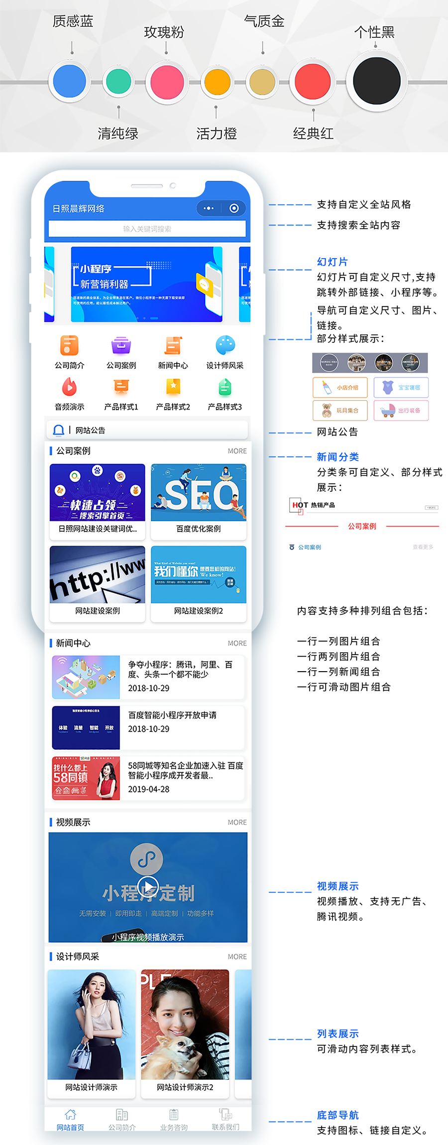企业网站小程序源码,支持自定义装修,支持幻灯片,