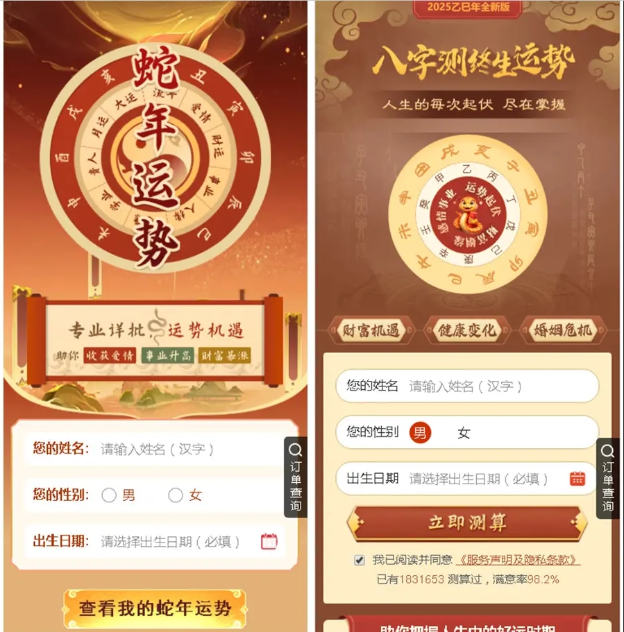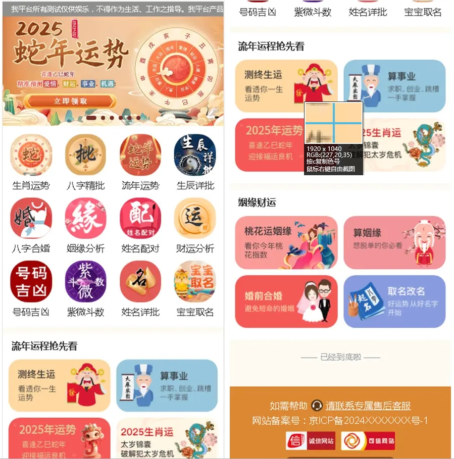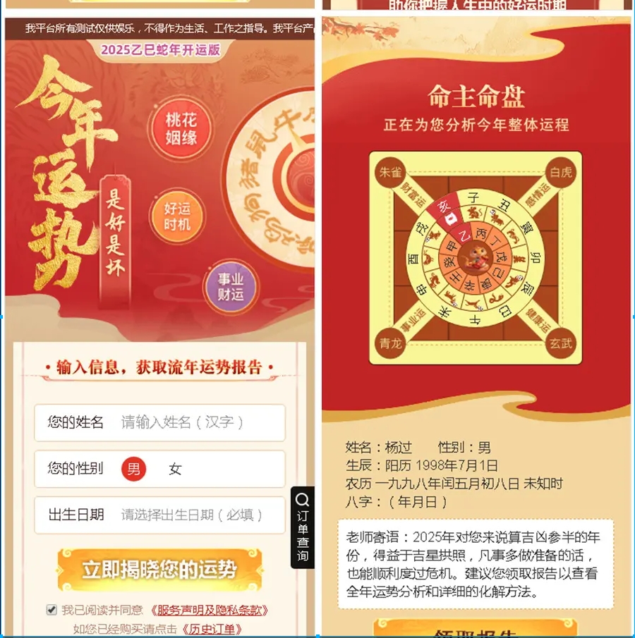 八字精批、事业财运、姓名分析、宝宝起名、姓名配对、综合详批、姻缘测算、八字合婚、紫微斗数、龙年运程、月老姻缘、号码解析、塔罗运势、塔罗爱情等。