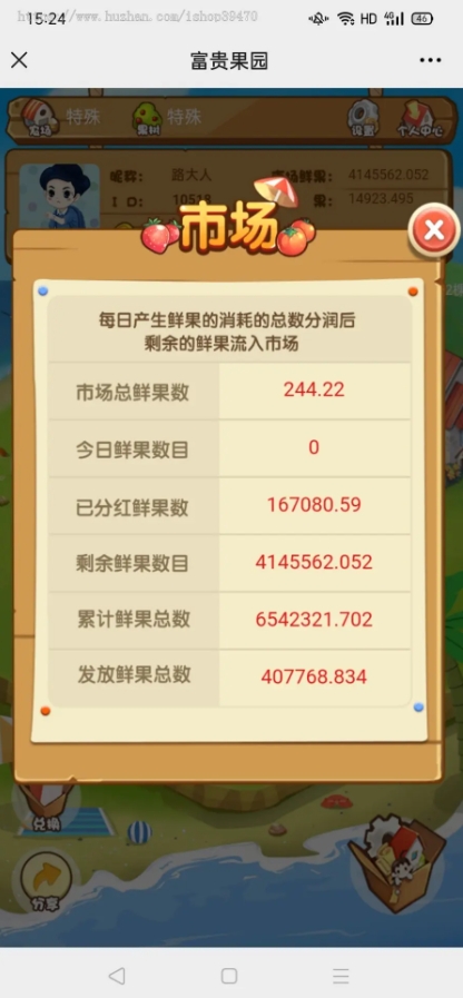 分红收益:市场鲜果的分红百分比!比方市场鲜果总数量100万!今日可以拿到1万鲜果分红!市场分红的鲜果数量非常大,千万不要回收分红树。