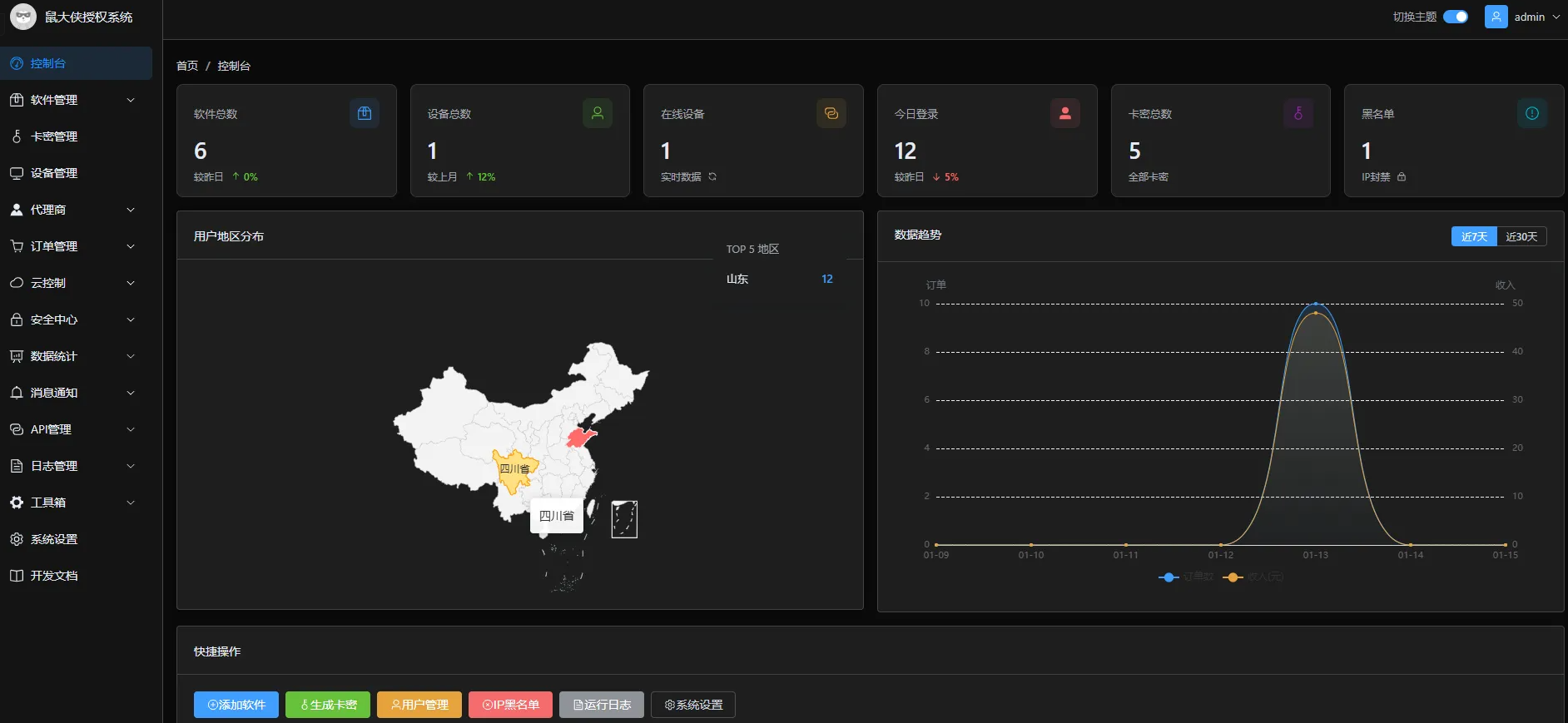 数据统计:控制台实时展示软件数、设备数、在线数、今日登录等数据