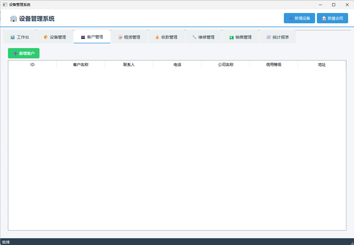 租赁管理 → 新建合同 → 选设备/客户 → 设置租金 → 保存