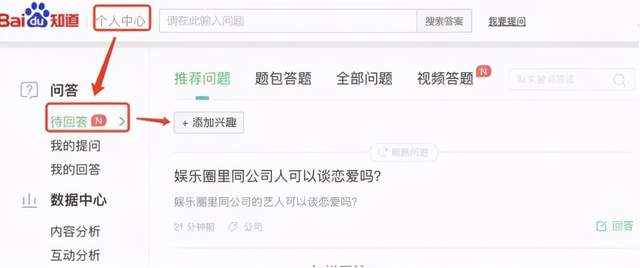 2、个人中心→待回答,找到添加兴趣,兴趣方面建议添加和自己项目相关的,此操作的目的在于给账号打标记,有助于提升后面回答相关领域的问题时候的权重。