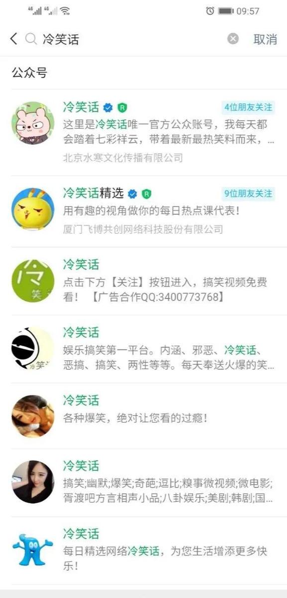 紧接着会发现有很多公众号名字都包含冷笑话精选这个关键词。为什么会有这么多人会取名字一样的呢?这背后必定有着赚钱的东西。