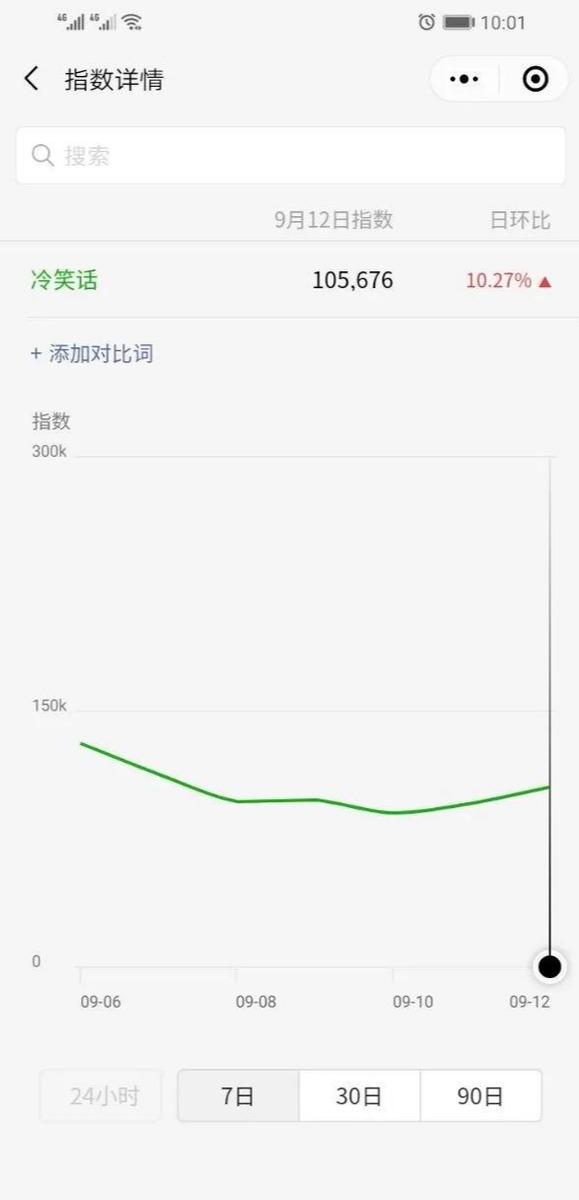 我随意截取几个账号内的数据大家看一下这是二组数据,第一个显然就是正宗的,第一个显然就是冷笑话精选大号了,第二个属于衍生品。到现在都有每篇都有七八千的阅读量。这说明什么呢?说明背靠这些大流量公众号不愁喝汤,而且还是做好的汤,自己就来了,流量为什么自己就来了呢?我们可以打开微信指数发现每天都有10万+的人在搜索冷笑话精选