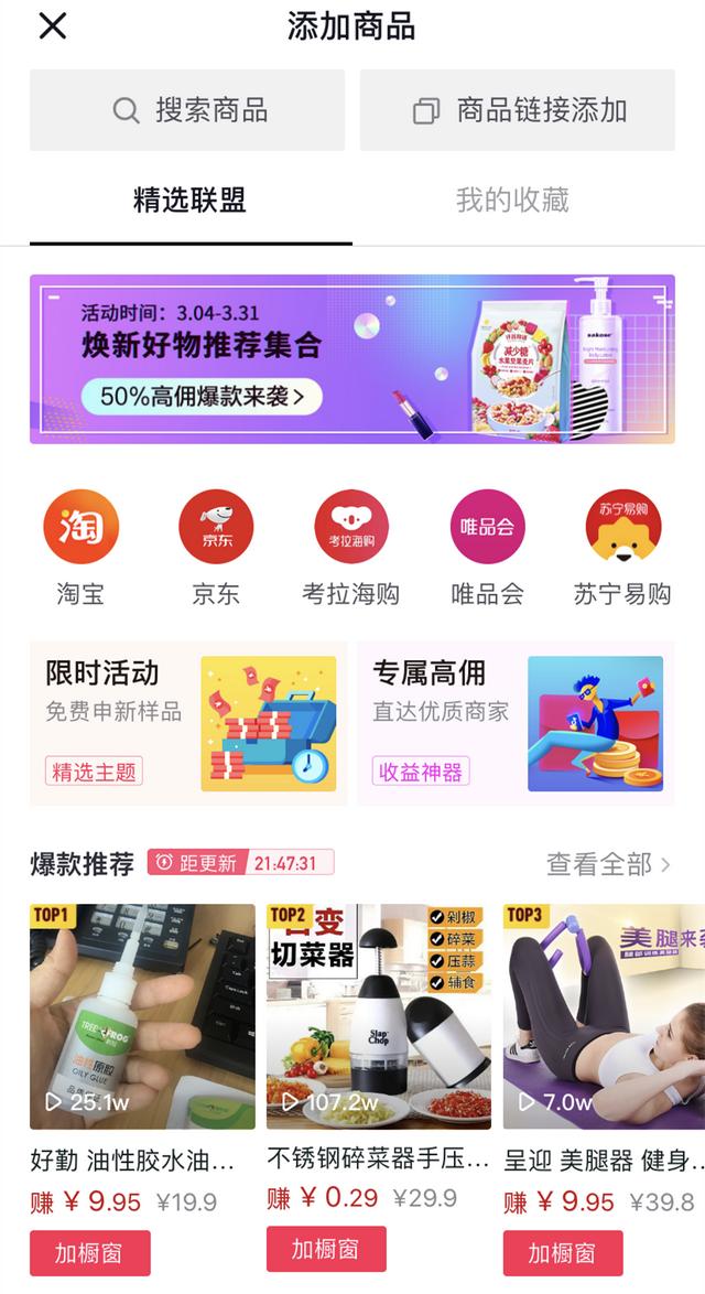 精选联盟就相当于一个巨大仓库,只有进入到这个仓库商品才能供带货达人在视频中挂链接进行推广销售。