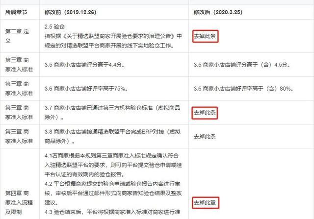 更新之后的精选联盟平台管理规则,取消了所有线下验仓审核的环节,并将审核标准进一步向商家服务质量方面靠拢。