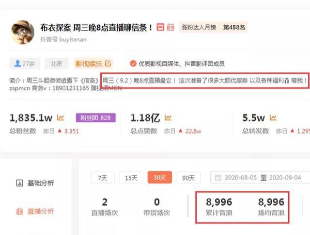 比如本周三,@布衣探案就特别开设了一场电影《信条》的新片推广直播。直播时长2小时48分,总人数21.8万。