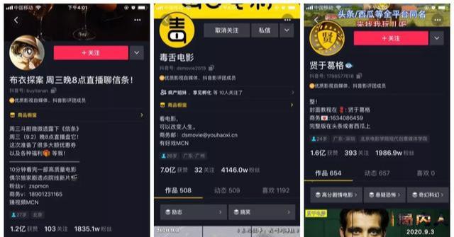 半年过去,以@毒舌电影(4105.7W粉丝)、@贤于葛格(1986.9w粉丝)、@伯乐说(1,349.4w粉丝)、@布衣探案(1835.1W粉丝)为代表的抖音影视号迅速崛起,盘踞在热门、涨粉等数个榜单前列。