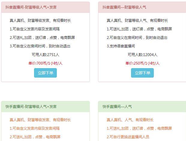 直播带货这股力量,也催生了一些服务行业,比如,直播人气、刷单等,直播人气分机器与真人,真人又分兼职及群控账号,手上有商家的,不管代运营还是单纯做数据维护,都能赚点钱,关键不在价格,在于你如何与商家谈,什么模式合作。当然,如果你能找到源头软件或者渠道,那利润就更高了。