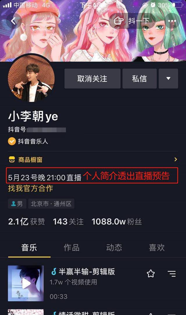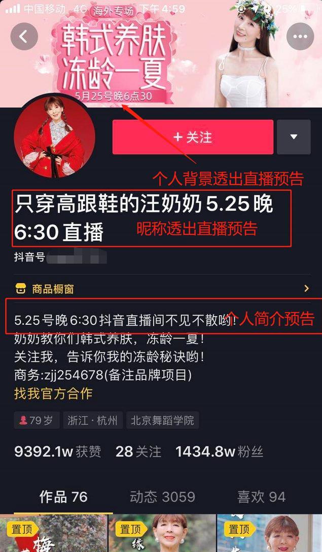 个人账号的信息更改,将抖音个人昵称、简介处添加直播预告,即直播时间日期时间点,如5月22号晚上8:00直播,通过这种方式做一个直播预告,粉丝知晓什么时候直播,会在这个时间点观看直播。