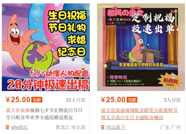 大家可以淘宝搜下派大星祝福关键词,一般这样的祝福视频市场价格在25-50元左右。而请人配音一分钟大概10元,量大的话5-8元。剩下的就是纯利润了,一条能赚10-30元。