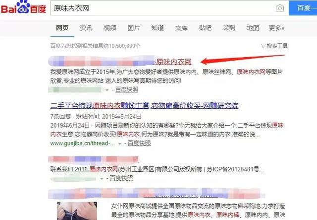 这个网站是在我根据上面这件事之后找到的一个网站,我们都知道有收集原味产品癖好的人数并不少,我们可以通过挖词工具就可以看到数值一直都是居高不下,当我在百度上搜索“原味内衣网”后就看到了以下的网站内容。