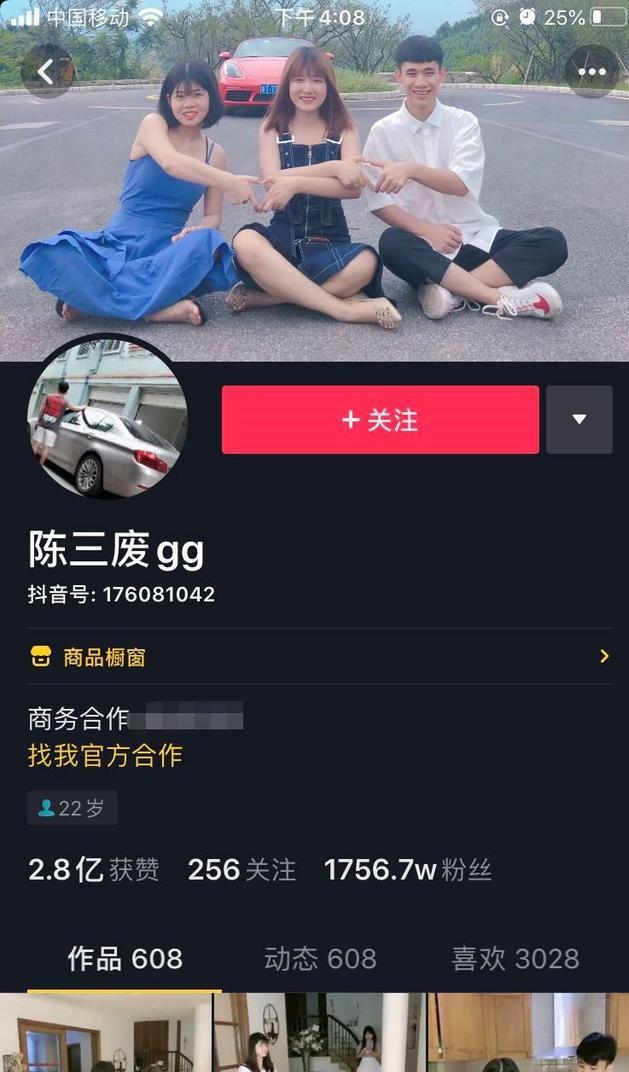 个人资料:简介为“商务合作:”,个人主页的背景图是陈三废夫妻与姐姐的合照,透出合作联系方式+突出账号的核心内容和人设;
