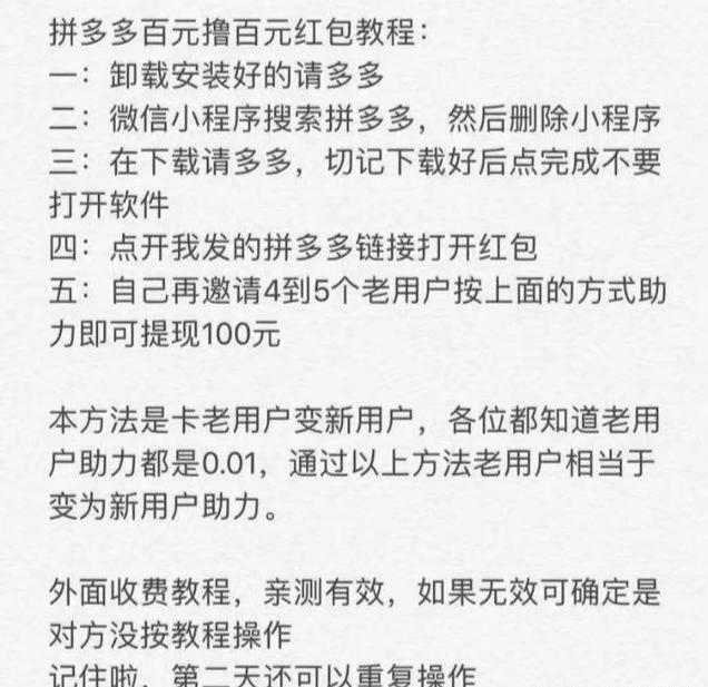 这是什么意思?意思就是说:咱们只要按照前两步操作,清理掉拼多多相关的软件和小程序,然后通过别人的助力链接重新打开,就等于新用户了。