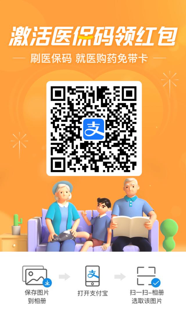 ①保存下图到相册 ;②打开支付宝扫码激活医保码;③领取红包 ;④分享好友,推广码自动保存到相册。