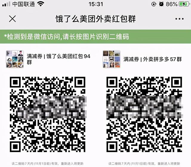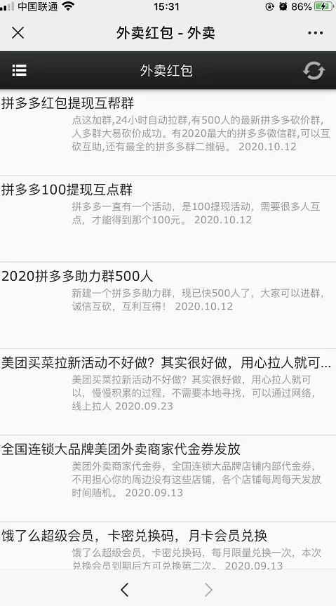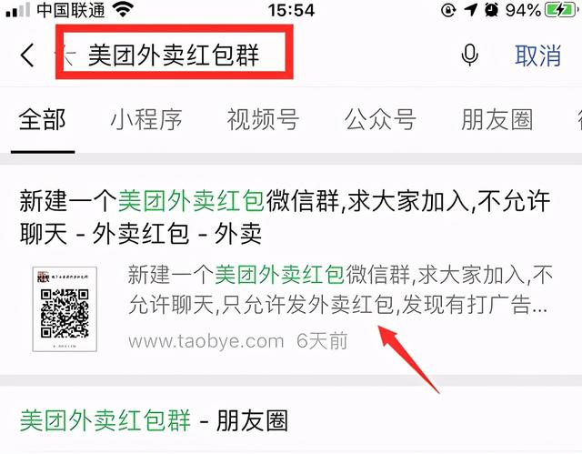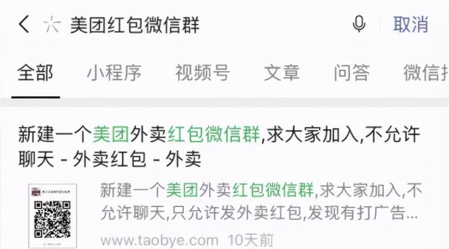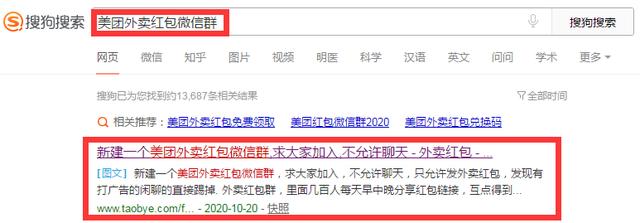 当我们在微信的搜索栏搜索:【美团外卖红包群】的时候会发现上图,排名第一名的,我们可以看到是一个一级域名的网站。