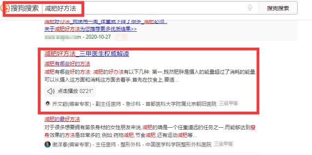 而我们在搜狗去搜索【减肥好方法】的时候,会发现排名第一的网站和在微信搜索的是一样的,如下图: