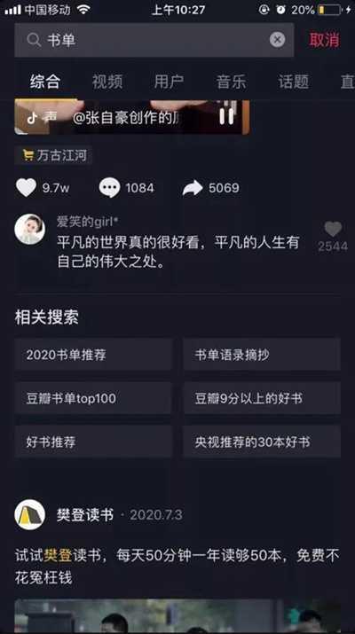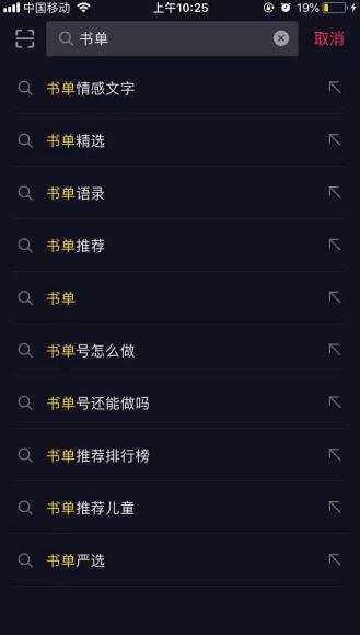 以“书单”为例,在抖音查找框输入“书单”二字,查找框会出现10个与书单的相关要害词。