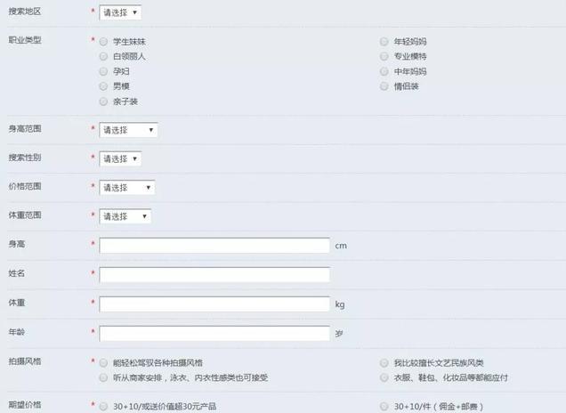 在这些平台我们可以看到已经入驻的模特,大家可以看到他们的职业,身高,体重,工作的地方和所期望的的价格。其中30+10的意思是,30佣金+10元邮费。