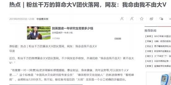 人为财死鸟为食亡,钱这个东西总是让人很上头,毕竟是暴力项目。2019年9月份左右,又一个微博知名算命大V挨抓了,成为当时的微博热点。