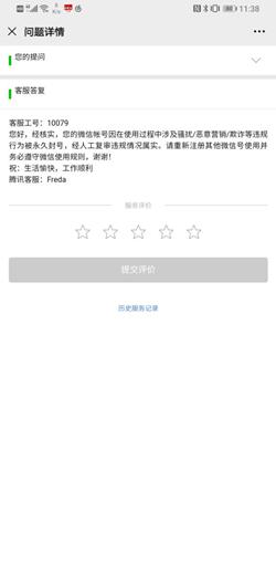 企业回复内容:经核实,您的微信账号因在使用中涉及骚扰/恶意营销/欺诈等违规行为被永久封号,经人工复审情况属实。请重新注册其他微信号使用