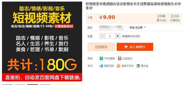 伴随着好奇心,我在某电商平台上搜索并打开了销量最佳的一款短视频素材包9.9元就能买到180G的素材,内容类型涵盖励志、情感、影视、生活、名人、养生、旅行、书单、音乐、哲理等等,可谓是一包在手天下我有。