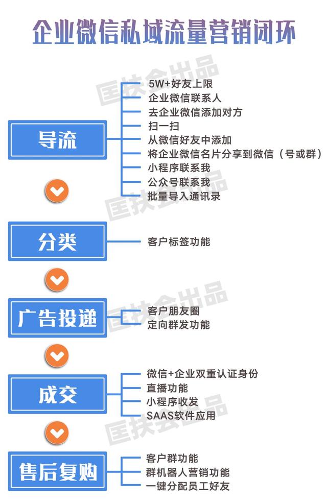 从上面不难看出,企业微信的各项功能,每个都是在帮企业建立私域流量的营销闭环,一张图总结如下。