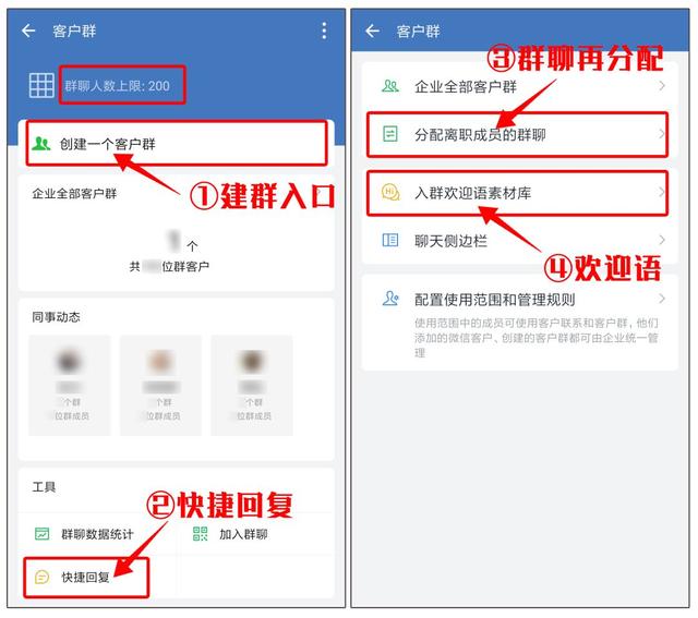 ⑤关于售后与复购:要做售后与复购?没问题,企业微信早就想到了,你可以建群,在群里做。目前企业微信的外部群最多200人,还破天荒的配置了欢迎语、自动快捷回复等营销功能,要知道放在以前,任何“第三方营销工具”都是红线禁区,这回自己给整上了,呵呵。