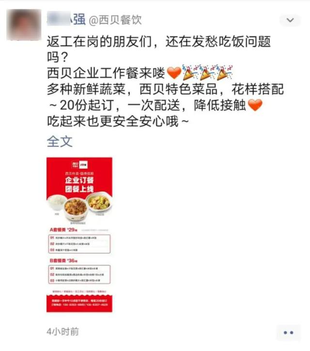▌西贝餐饮连锁:1月份线上添加3万+客户,通过群发消息、1对1交流、企业微信朋友圈等给顾客提供外卖送餐和食材订购服务,据说他们企业微信端营收已占到总营收80%+。