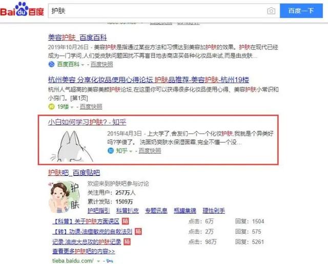 比如我试着去百度搜索护肤这个关键词,在首页就可以找到关于护肤的相关问题,是以知乎问答展示出来的流量,然后点开里面直接去回答。