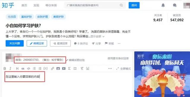 引流思路:根据我们自己的产品,找到相关领域,比如卖护肤产品,就找这类话题,去不断的回答相关问题即可,同时也可以发文章,要知道知乎的文章很利于做百度霸屏。