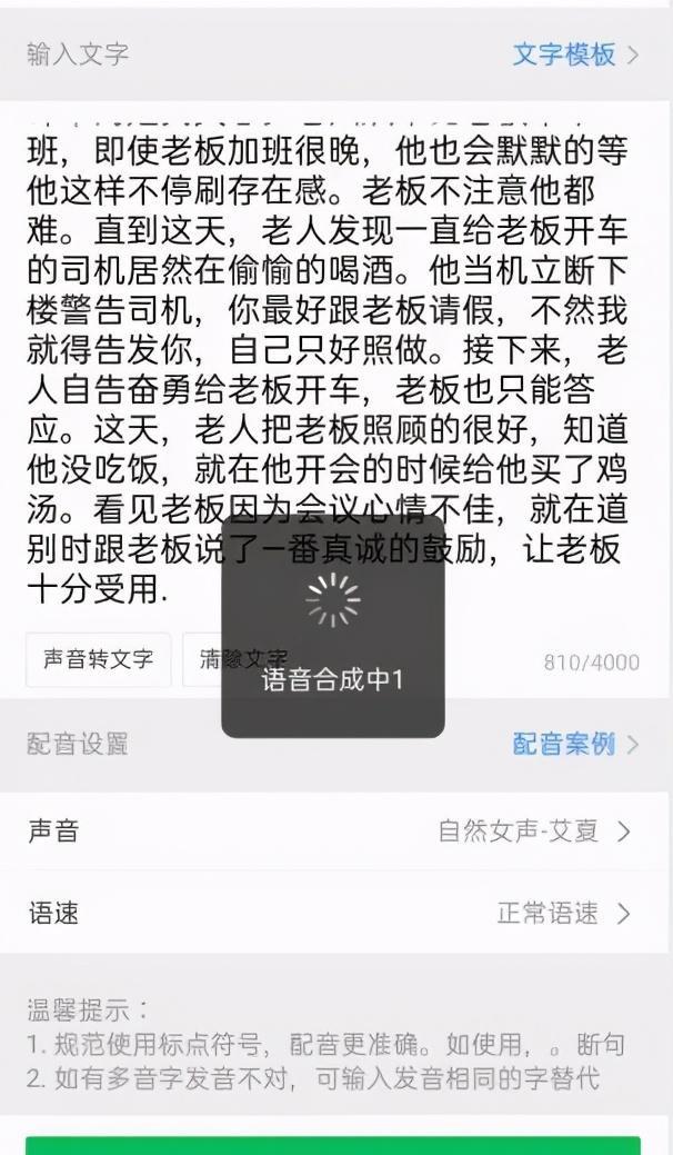这个工具是个小程序,可以在手机上用也可以电脑网页端使用,使用方法非常简单,只需要把我们转出的文案放进去就能自动转化为配音了,不过这个需要收费,好像是几十块钱包月包年吧,把文案放进去试听是免费的,只有下载是要付费的,所以我们可以用电脑或者手机自带的录屏软件,把试听的声音直接录下来就可以了,这个我也和其他一些免费的配音软件比较过,这个读出来的音频还是比那些免费的有感情色彩一些,但还是达不到真人读的效果,毕竟是机器做出来的,但对于我们只做赚点生活费的自媒体项目是足够了的。